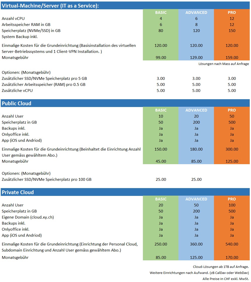 Setzen Sie für Ihre Daten auf eine zuverlässige Lösung. Wählen Sie aus den untenstehenden Möglichkeiten die passende Grösse für Ihr Unternehmen. Sollten sich die Bedürfnisse ändern, passen wir das gewählte Angebot Ihren Wünschen an. Ohne Wenn und Aber.